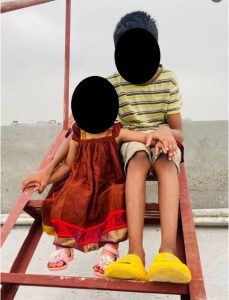 • তৃতীয় ছবিতে দুটি শিশুকে দোলনায় বসে থাকতে দেখা গেলেও, সেগুলোর মুখ ঢেকে দেওয়া হয়েছে।